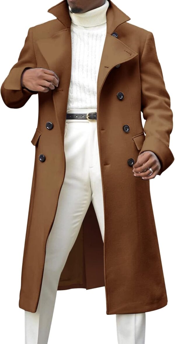 Men’s Notch Lapel Double Breasted Long Trench Coat Casual Cotton Blend Peacoat